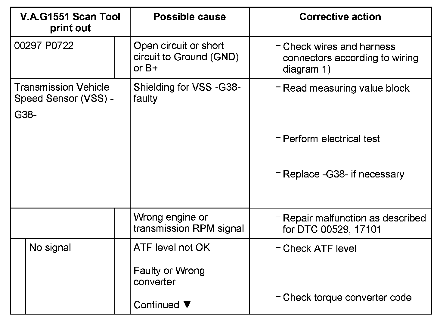 Diagnostic Trouble Codes 00297 / P0722 and 17106 / P0722 - 5 Spd. Automatic Transmission 01V