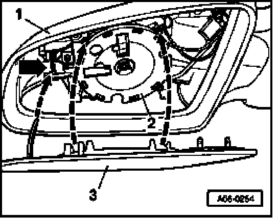 - Position the mirror glass -3- with catches in direction of arrow onto the base carrier -2-.