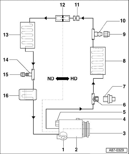 - All refrigerant circuit components not marked with 1) as well as all coolant hoses and - lines can only be serviced or replaced in an A/C system service point workshop (refrigerant circuit must be discharged).