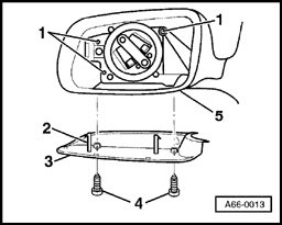 - To remove, pry off mirror glass, disconnect harness connectors for mirror heater, unscrew Phillips-head screws - 6 - and remove mirror adjustment unit from mirror housing - 1 -.