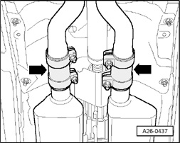 - Unscrew bolt - arrow - at bracket for front exhaust pipe (right-side).
