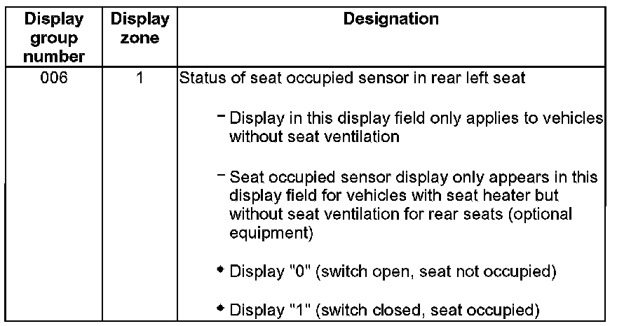 - The display in display groups "006" and "007" differs depending on whether Rear A/C Control Head (Climatronic) E265 was installed prior to or as of November 2002. Furthermore, display group "008" was no longer used in version as of November 2002.