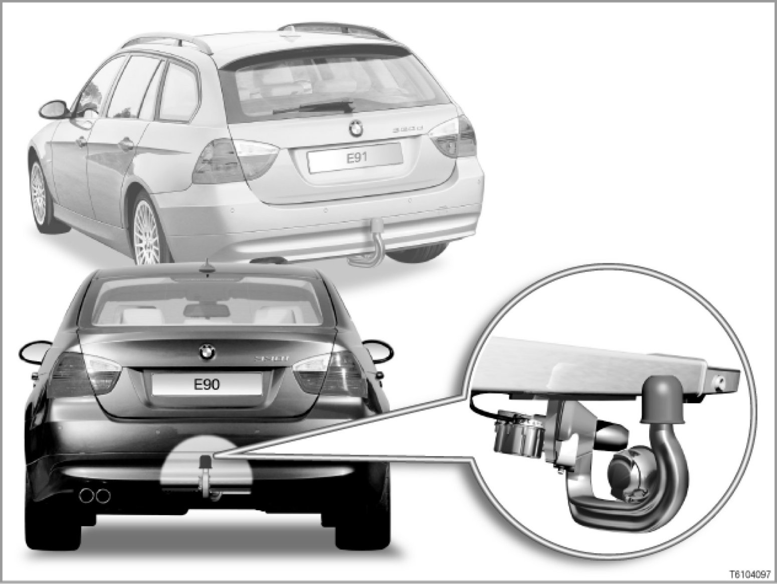 The BMW 3 Series can be equipped with an electrically released trailer coupling (option 3AC "trailer coupling with pivoted ball head").