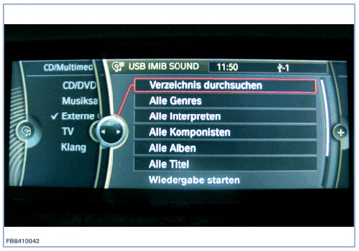 NOTE: Only perform the USB tests with the USB cable provided in the scope of delivery of the IMIB. Always perform USB tests directly at the USB connection of the vehicle! Do not use extension cables, USB hubs etc.