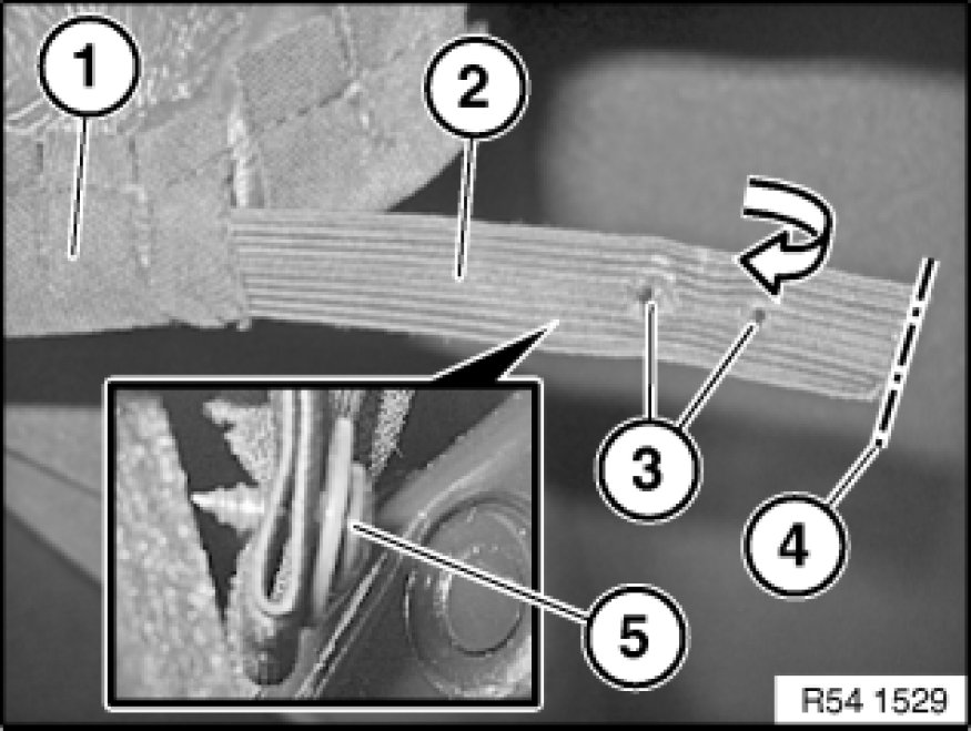 If necessary, cut off roofliner rubber strap (2) in area (4).