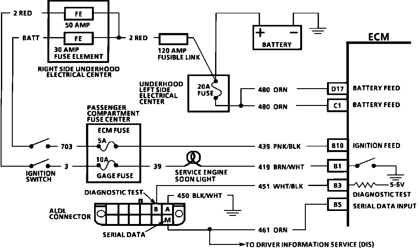 There should always be a steady "SERVICE ENGINE SOON" Light when the ignition is "ON" and engine stopped. Battery ignition voltage is supplied to the light bulb. The electronic control module (ECM) will turn the light "ON" by grounding CKT 419 at the ECM. With the diagnostic terminal grounded, the light should flash a Code 12, followed by any trouble code(s) stored in memory. A steady light suggests a short to ground in the light control CKT 419, or an open in diagnostic CKT 451.
