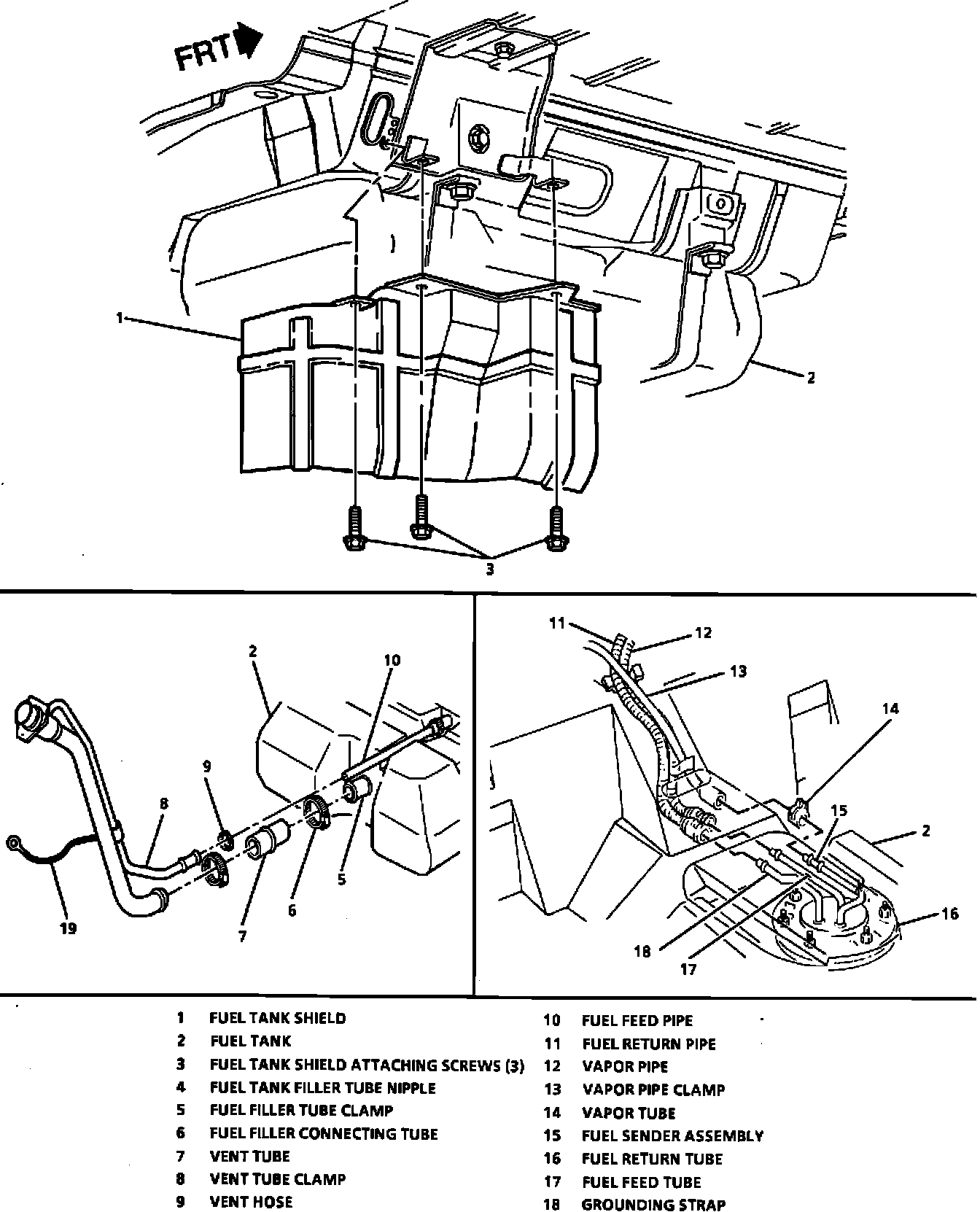 WARNING: To help avoid personal injury when a vehicle is on a hoist, provide additional support for the vehicle on the opposite end from which components are being removed. This will reduce the possibility of the vehicle falling off the hoist.Fuel Tank Mounting: