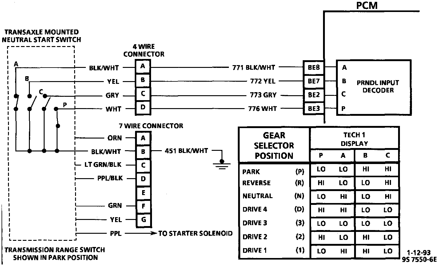The transmission range switch is part of the Transmission Neutral Start Switch (TMNSS) mounted on the transaxle assembly. It is a multi-signal switch sending information relative to gear selector position to the Powertrain Control Module (PCM). The Park Reverse Neutral Drive Low (PRNDL) input consists of 4 discrete circuits to pull 4 PCM voltages low in various combinations to indicate each gear range. The voltage level of each of the circuits is represented as low = grounded circuit, high = open circuit. The 4 states displayed represent decoder Parity, A, B, and C inputs respectively.