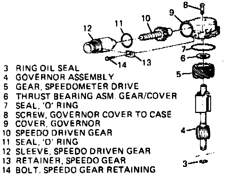 6. Remove speedometer drive gear thrust washer and gear, then the governor assembly, Fig. 11.