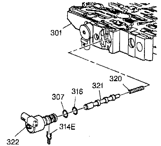 7. Disassemble the pressure control solenoid valve (322), torque signal regulator valve (321), and regulator valve spring (320) from the valve body (301).