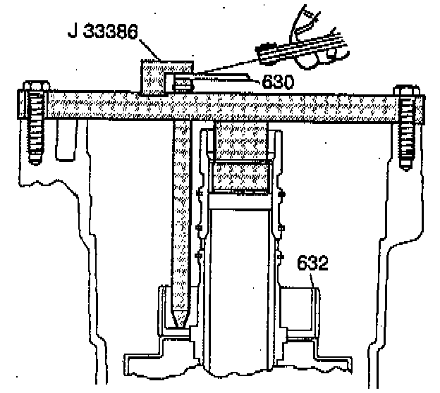 12. Use a feeler gage in order to measure the clearance between J 33386 and the thrust washer (630):