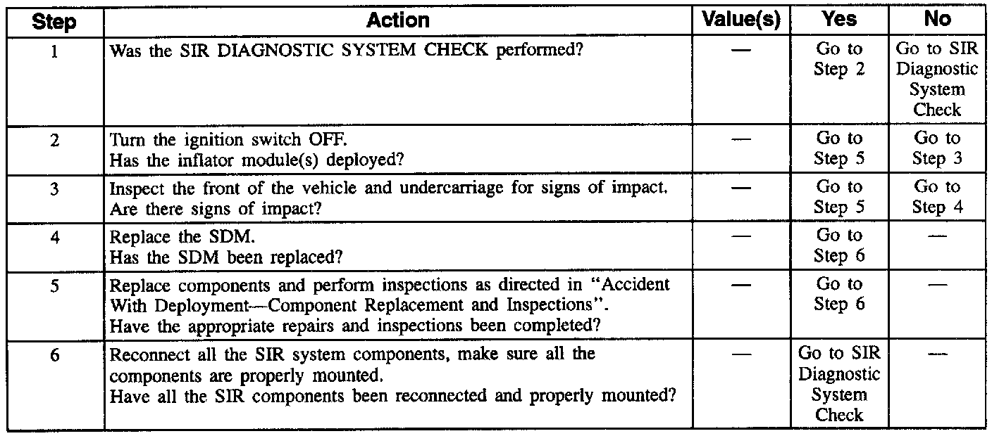The inflatable restraint Sensing and Diagnostic Module (SDM) contains a sensing device that converts vehicle velocity changes to an electrical signal. The SDM processes the generated electrical signal and compares it to a value stored in memory. When the generated signal exceeds the stored value, the SDM performs additional signal processing and compares the generated signals to signals stored in memory. When two of the generated signals exceed the stored values, the SDM will cause current to flow through the inflator modules, deploying the air bags and causing DTC B1051 to set.
