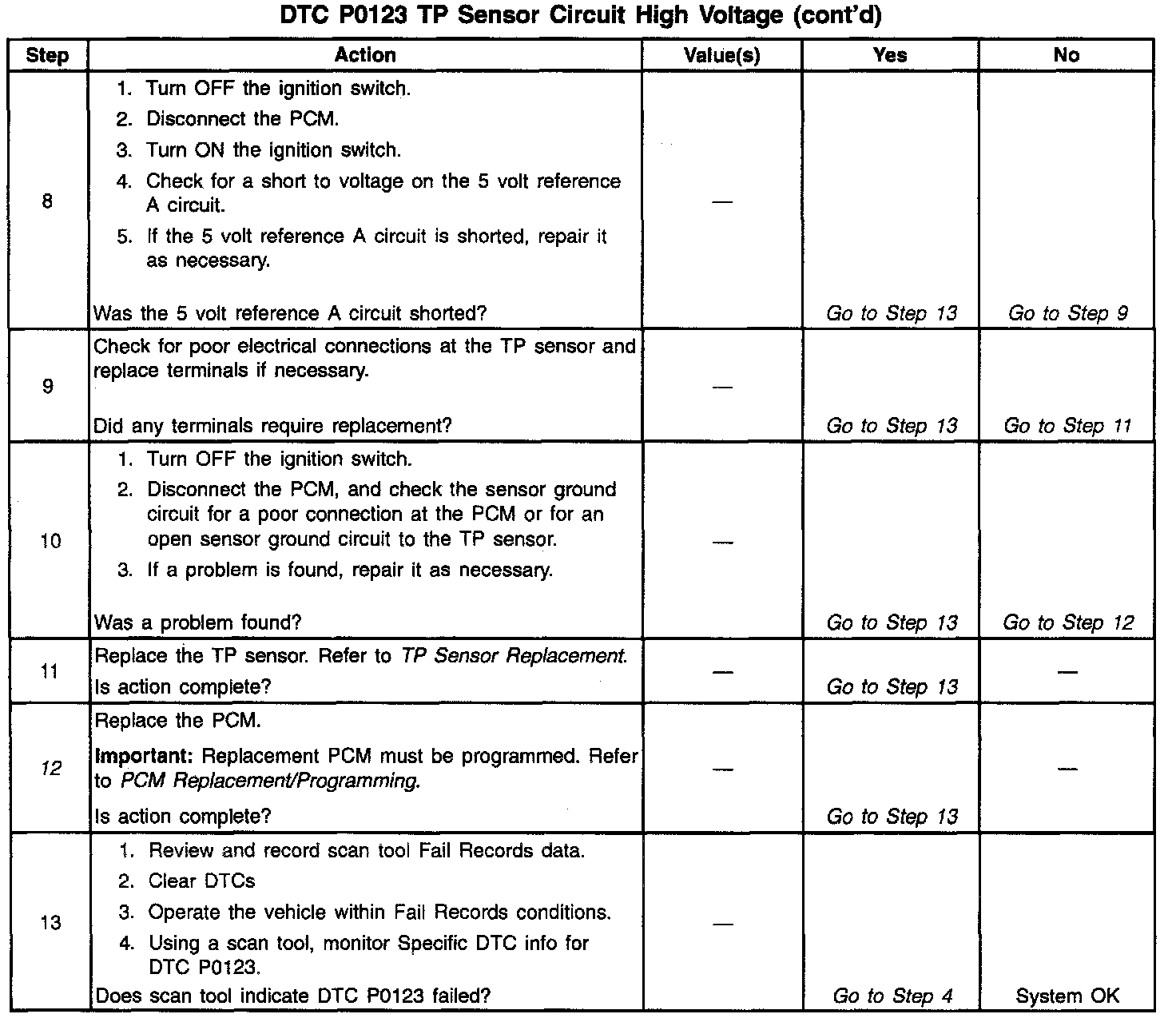 The Throttle Position (TP) sensor circuit provides a voltage signal that changes relative to throttle blade angle. The signal voltage will vary from below 1 volt at closed throttle to about 4 volts at Wide Open Throttle (WOT). The TP signal is one of the most important inputs used by the PCM for fuel control and most of the PCM-controlled outputs. DTC P0123 will set when the PCM detects an excessively high signal voltage on the throttle position sensor signal circuit.
