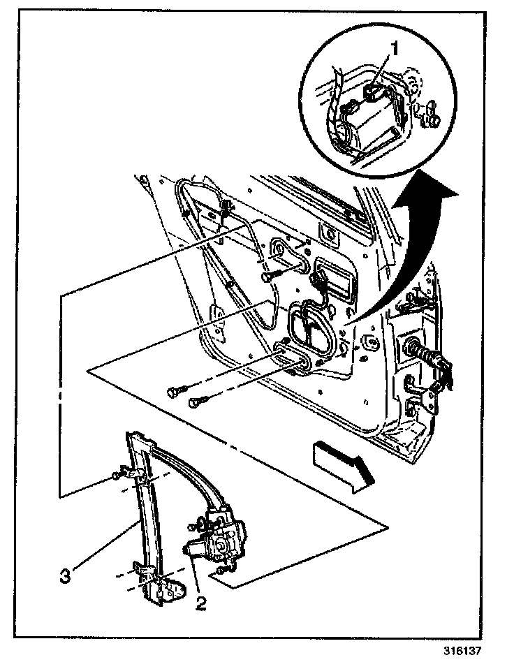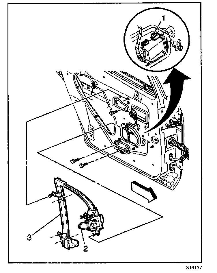 IMPORTANT: The door window regulator motor and door regulator are serviced as a unit.