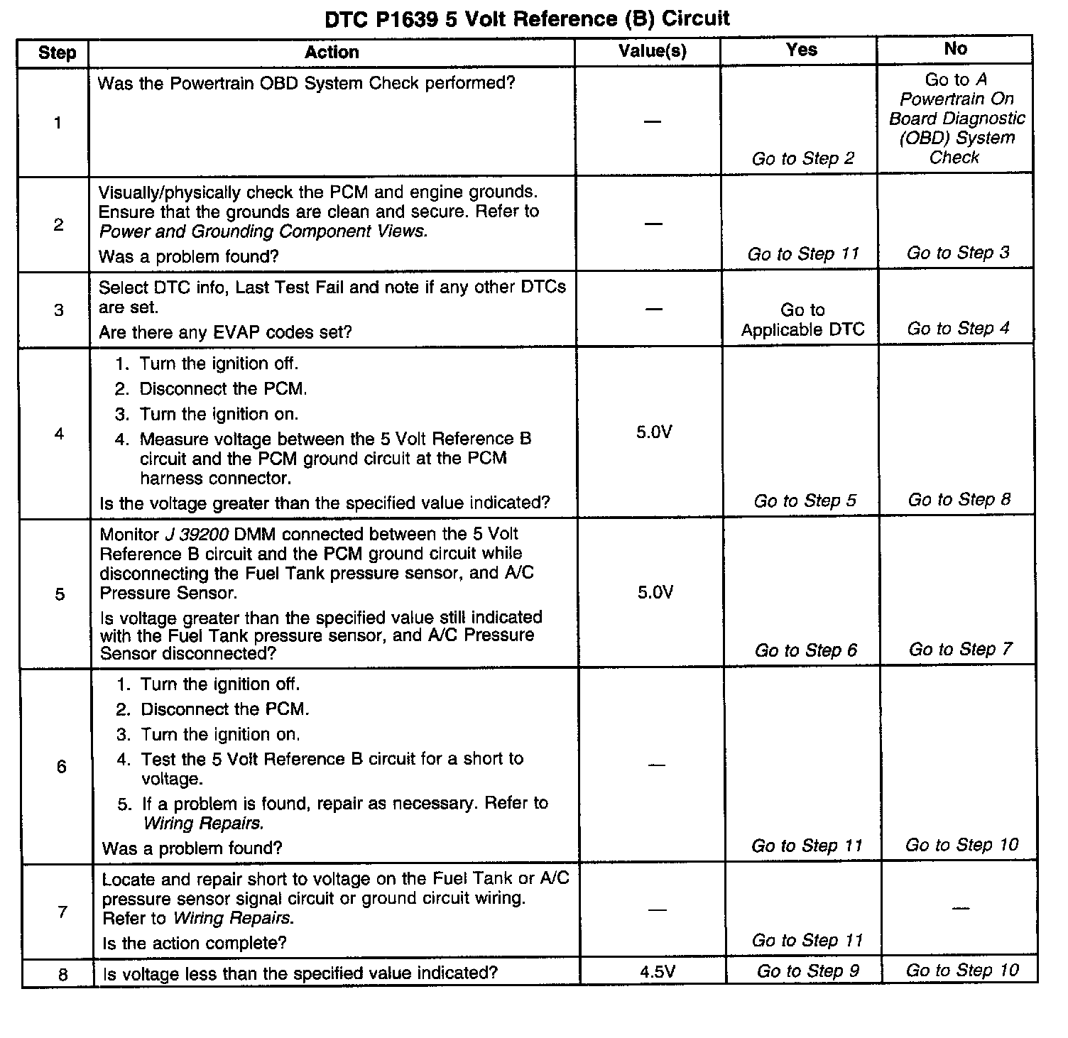 The PCM uses the 5 Volt Reference B circuit as a sensor feed to the A/C Pressure Sensor and the Fuel Tank Pressure sensor. The PCM monitors the voltage on the 5 Volt Reference B circuit. If the voltage is out of tolerance, the PCM will set DTC P1639.