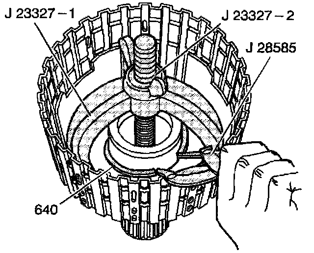 11. Use J 23327 and J 28585 in order to install the snap ring (640) in the third clutch housing.
