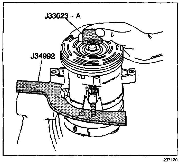 9. Install the J 8433-1 and the J 8433-3 with the J 33025 on the front head of the compressor.