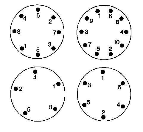 Improper wheel nut tightening can lead to brake pulsation and rotor damage. In order to avoid additional brake repairs, evenly tighten the wheel nuts to the proper torque specification as shown for each vehicle in SI. Always observe the proper wheel nut tightening sequence as shown below in order to avoid trapping the wheel on the wheel stud threads or clamping the wheel slightly off center resulting in vibration.