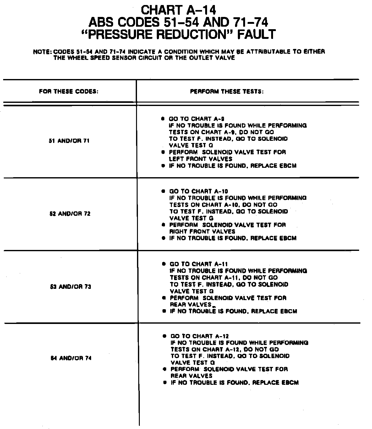 Fig. 67 Chart A-14, Codes 51-54 & 71-74 (Pressure Reduction Fault). 1989-90 Models Except 6000: