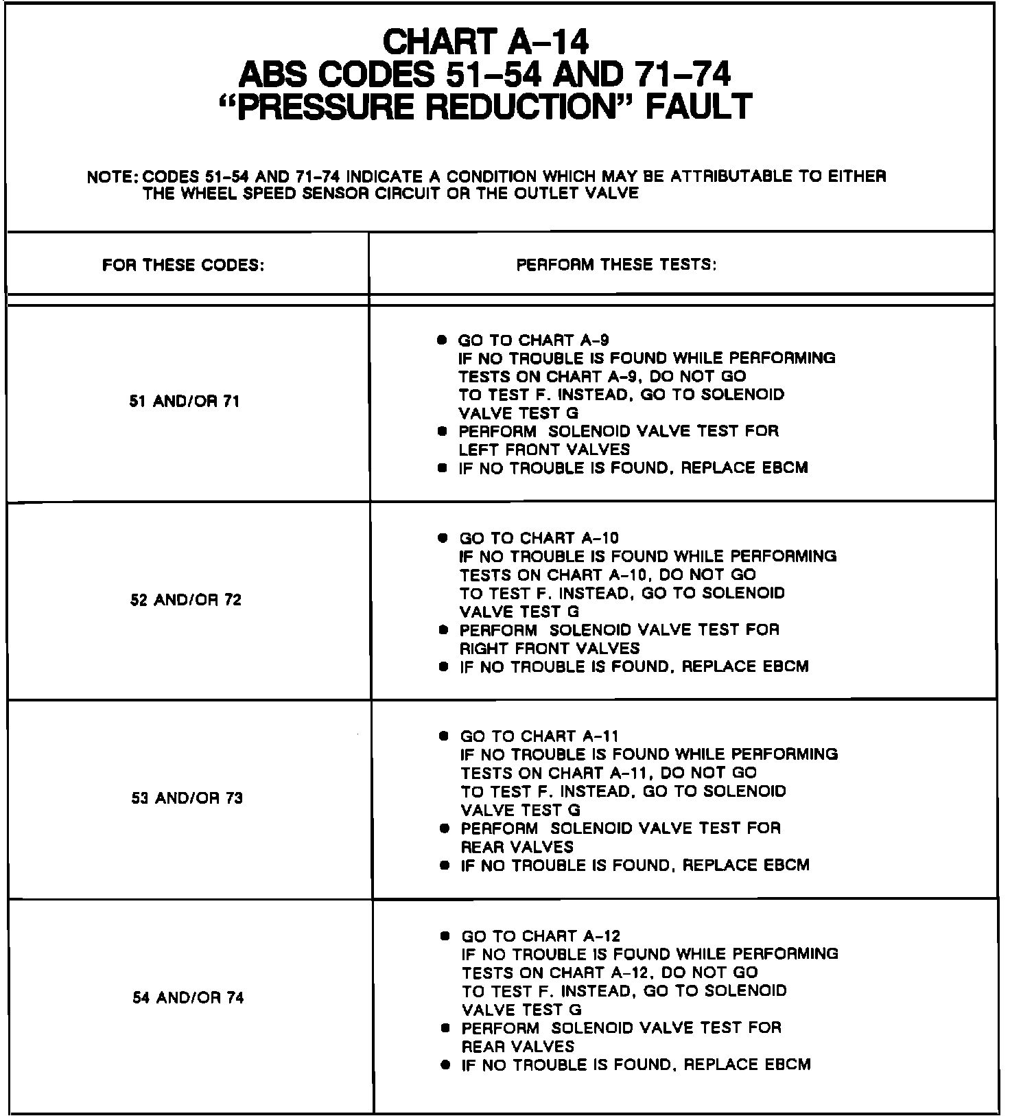 Fig. 26 Chart A-14, ABS Trouble Codes 51-54 & 71-74 (Pressure Reduction Fault):