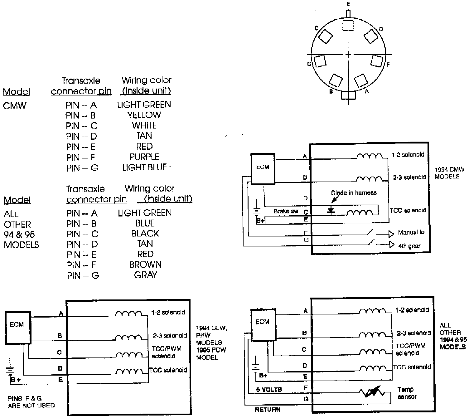 Wiring color and pin configuration has been changed on all 4T60-E models. These changes allowed for the addition of a fluid temperature sensor for some models and complemented the changes made to the vehicle wiring harness and PCM.