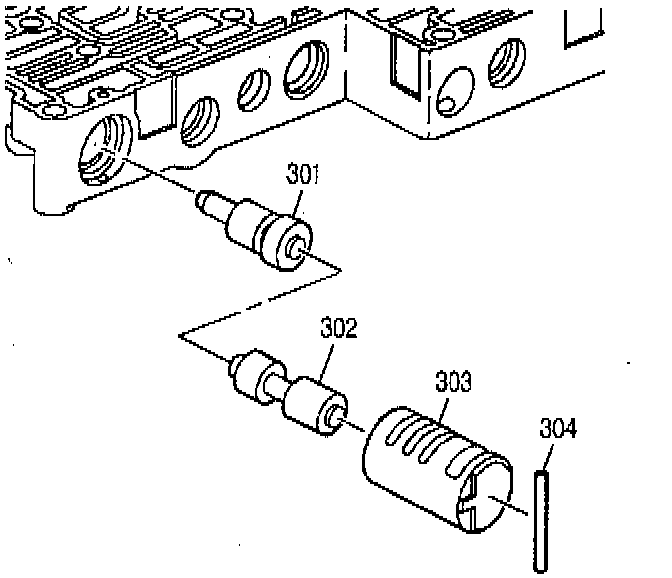 13. Remove the coiled spring pin (304), the 1-2, 3-4 accumulator bushing (303), and the accumulator valves (301, 302). Inspect the valves for nicks, scratches, or wear.