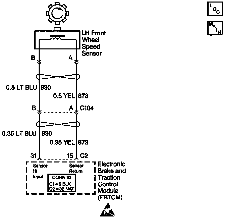 The wheel speed sensor used on this vehicle is a single point magnetic pickup. This sensor produces an AC signal that the Electronic Brake and Traction Control Module (EBTCM) uses the frequency from to calculate the wheel speed.