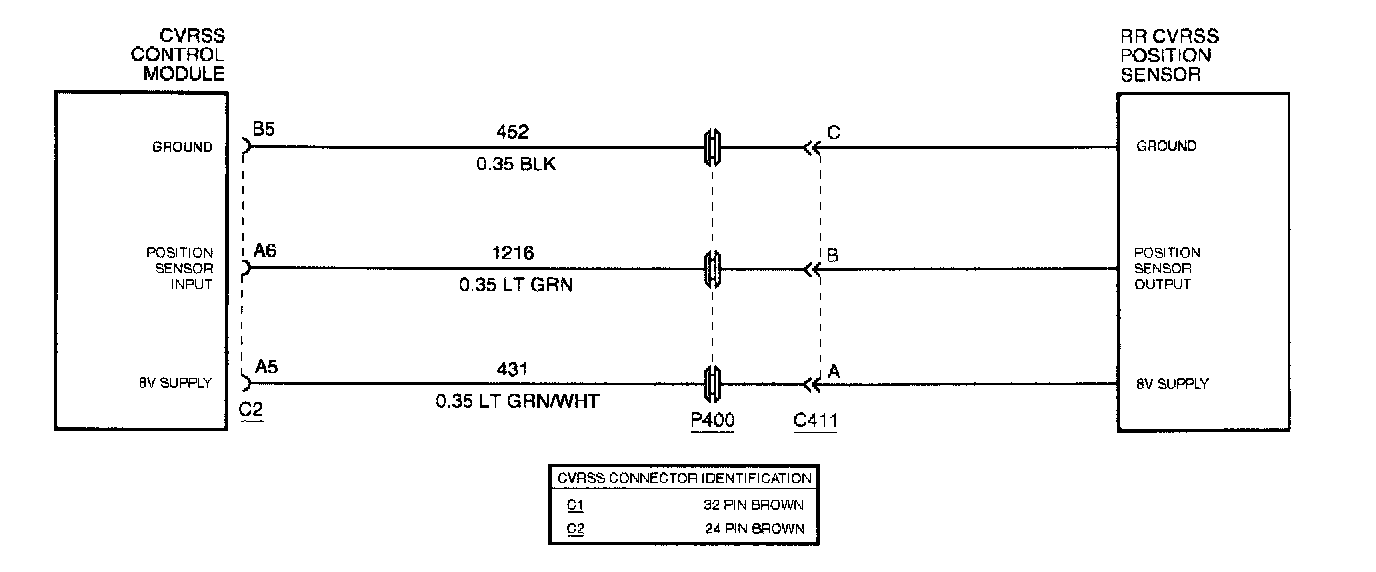 The CVRSS position sensor provides an analog voltage (0 to 5 volts) to the CVRSS control module which represents the position between the body and the wheel. The CVRSS control module provides the sensor with an 8 volt supply. The sensor is also grounded through the CVRSS control module.