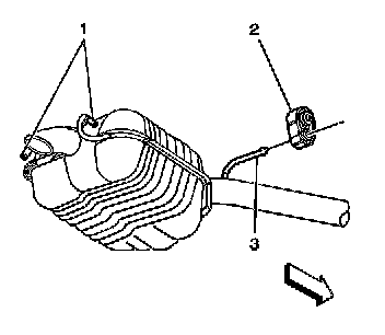 7. Pry the front exhaust hanger (1) free from the rear suspension hanger rod.
