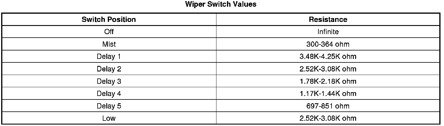2. Test the resistance between terminals H and L. Rotate the wiper switch and compare the resistance readings to the values in the Windshield Wiper Switch Values table below for MIST, each DELAY and LOW speed.