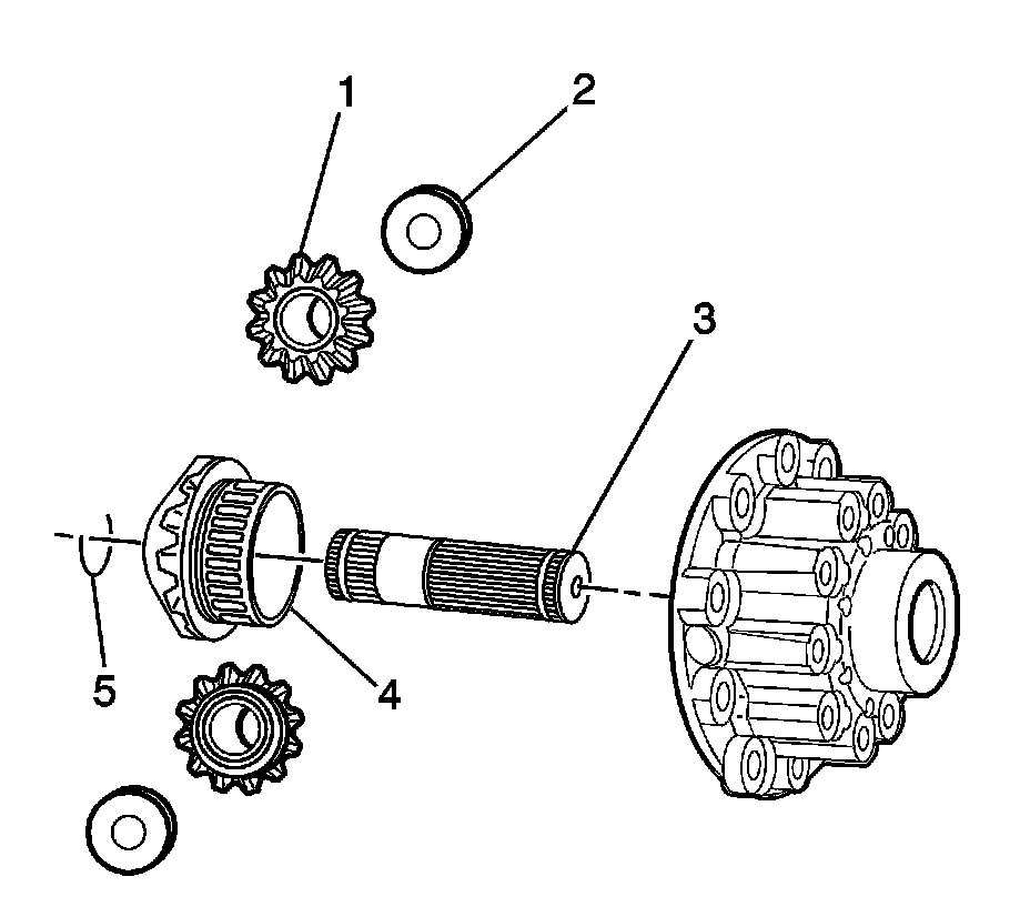 17. Remove the right side gears (1), side gear washers (2), and output shaft and gear (3) from the right differential case.