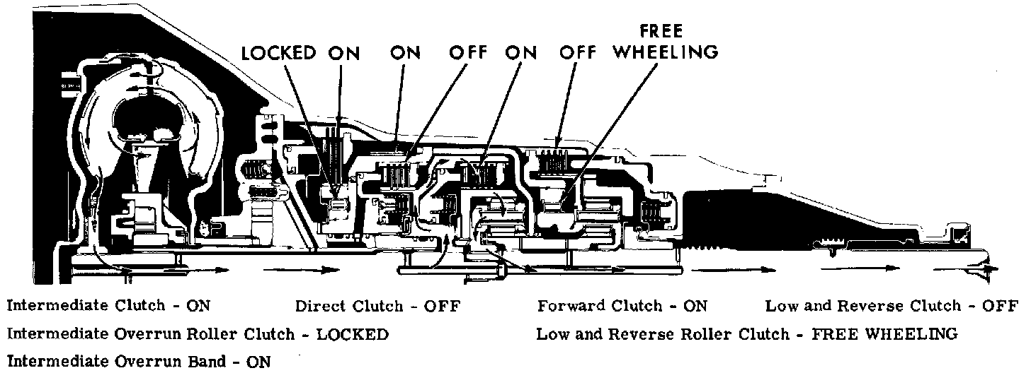 The intermediate clutch is applied to allow the intermediate overrun roller clutch to hold the shell and sun gear stationary against counterclockwise rotation. Turbine torque, through the applied forward clutch, is delivered to the input ring gear in a clockwise direction. Clockwise rotation of the input ring gear causes the output planet pin ions to walk around the stationary sun gear in a clockwise direction. This causes the output ring gear and output shaft to turn in a clockwise direction at a reduction of approximately 1.52 to 1. The reaction of the output planet pinions against the sun gear is taken by either the intermediate overrun roller clutch or the intermediate overrun band.