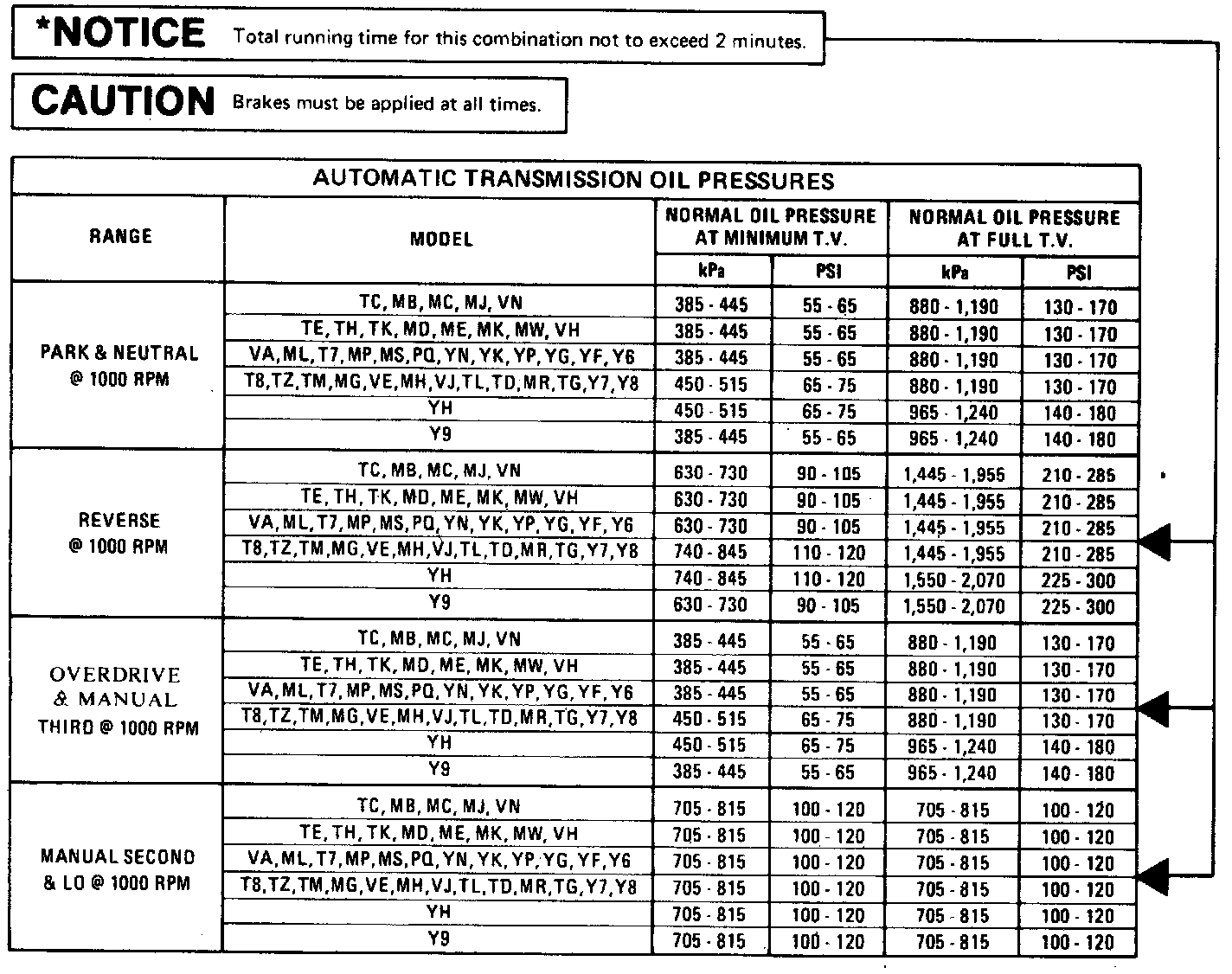 ^ To check minimum T.V. line pressure: set T.V. cable to specification, apply brakes, and take line pressure readings in ranges and at engine RPM's indicated in chart.