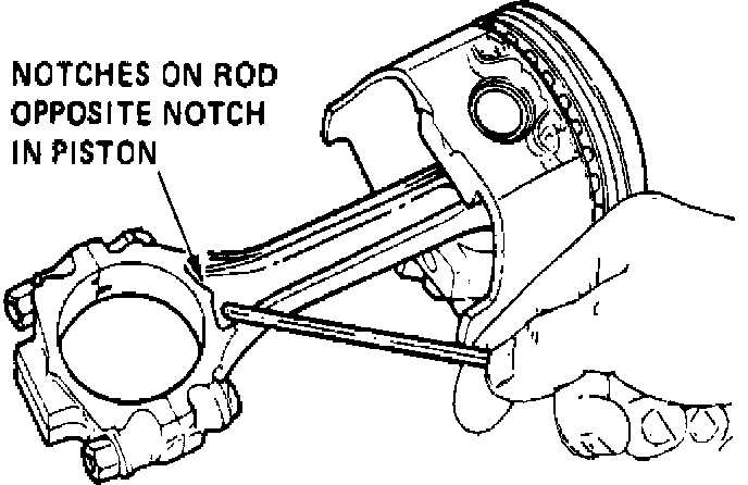 There are 2 notches in the piston crown. When assembling pistons onto connecting rods, position rod so that raised notch side of rod at bearing end, Fig. 8, is opposite notch in piston crown. Install piston and rod assemblies in engine block with notches in piston crowns facing front of engine. After installation, check connecting rod side clearance. If clearance is not .006-.022 inch, connecting rod should be replaced.