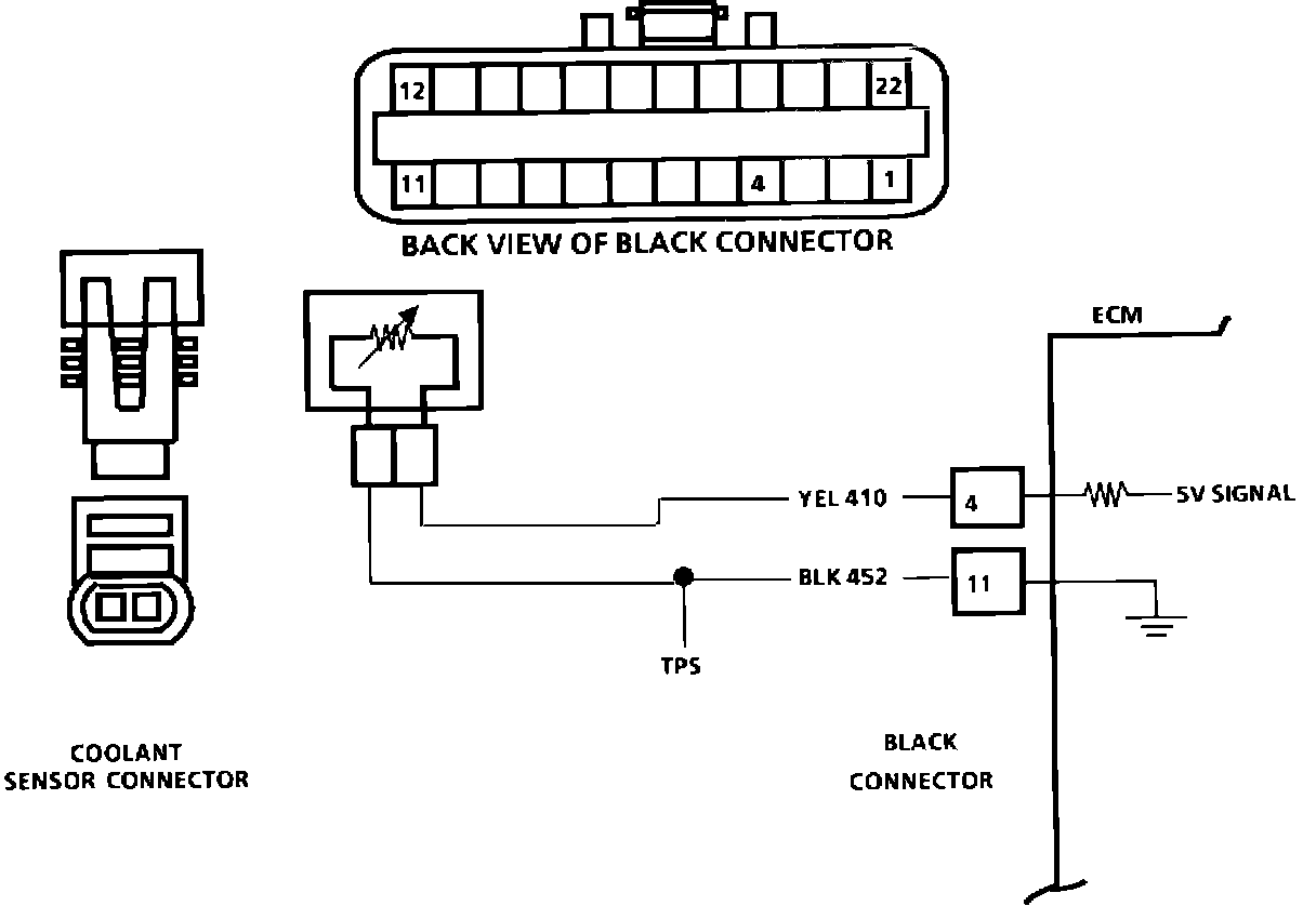 The Coolant Sensor uses a thermistor to control the signal voltage to the ECM. The ECM applies a voltage on CKT 410 to the sensor. When the engine is cold, the sensor (thermistor) resistance is high, therefore, the ECM will see high signal voltage.