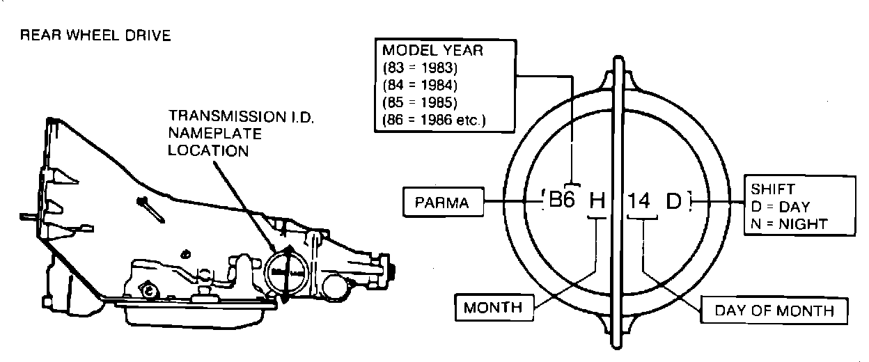 This information is intended to assist field technicians in understanding the transmission identification (I.D.), its meaning, and where it is located on currently manufactured THM automatic transmissions. The transmission identification tag or stamped identification contains such information as transmission type, model year, model, serial number, and Julian date.. Refer to the following information and illustrations which will help explain all transmission identifications: