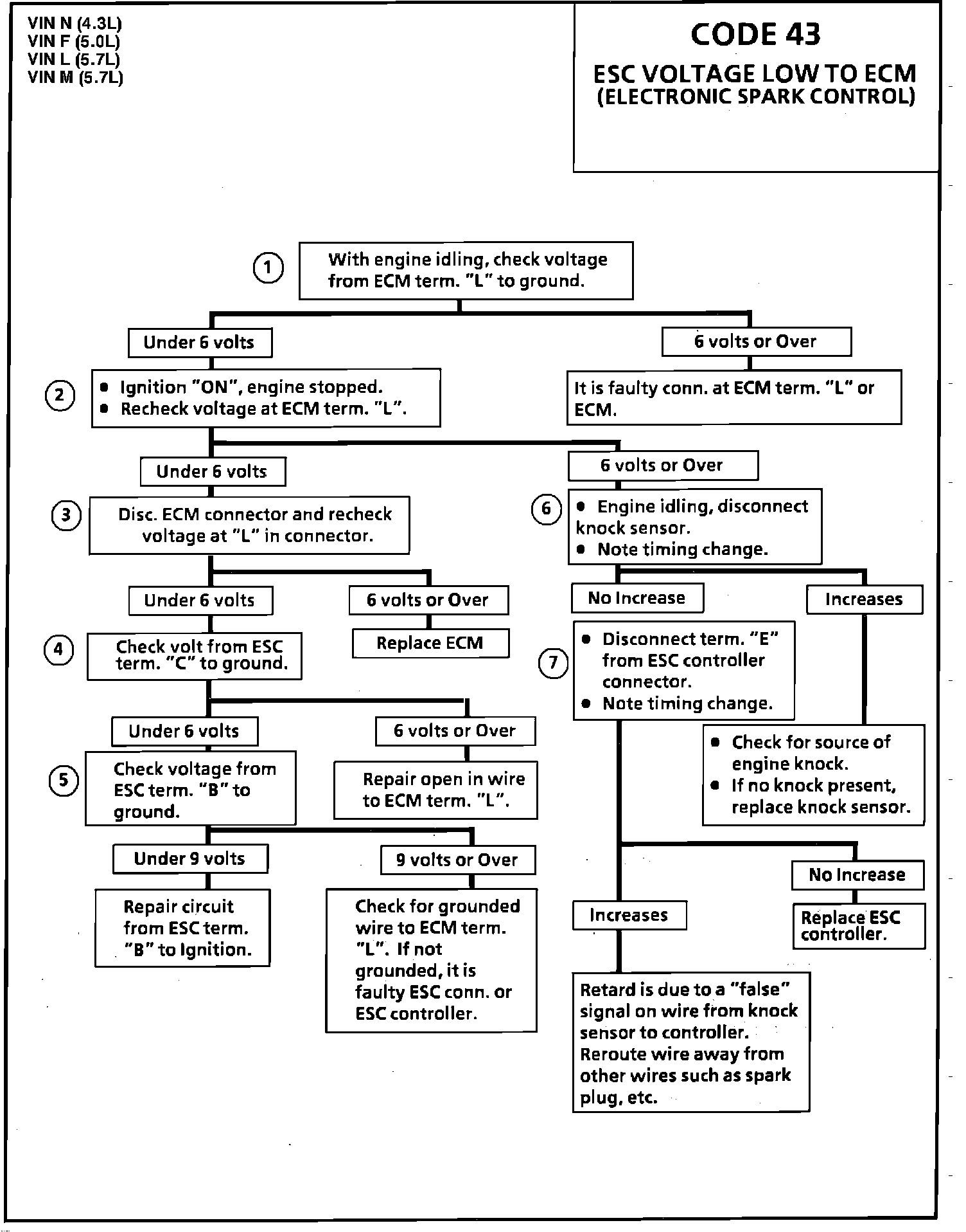 Code 43 says that the Electronic Spark Control (ESC) retard signal has been seen by the ECM for too long a period of time. When voltage at Terminal "L" at the ECM is low, spark is retarded. Normal voltage in non-retard mode is about 7.5V or more.