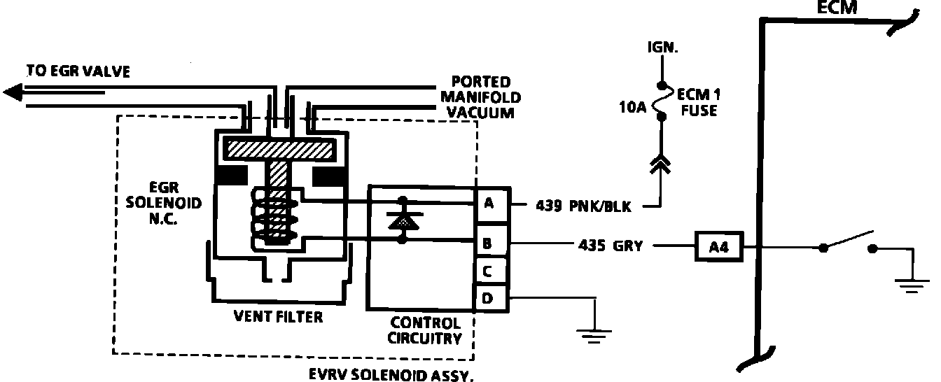 The ECM operates a solenoid to control the Exhaust Gas Recirculation (EGR) valve. This solenoid is normally closed. By providing a ground path, the ECM energizes the solenoid which then allows vacuum to pass to the EGR valve.