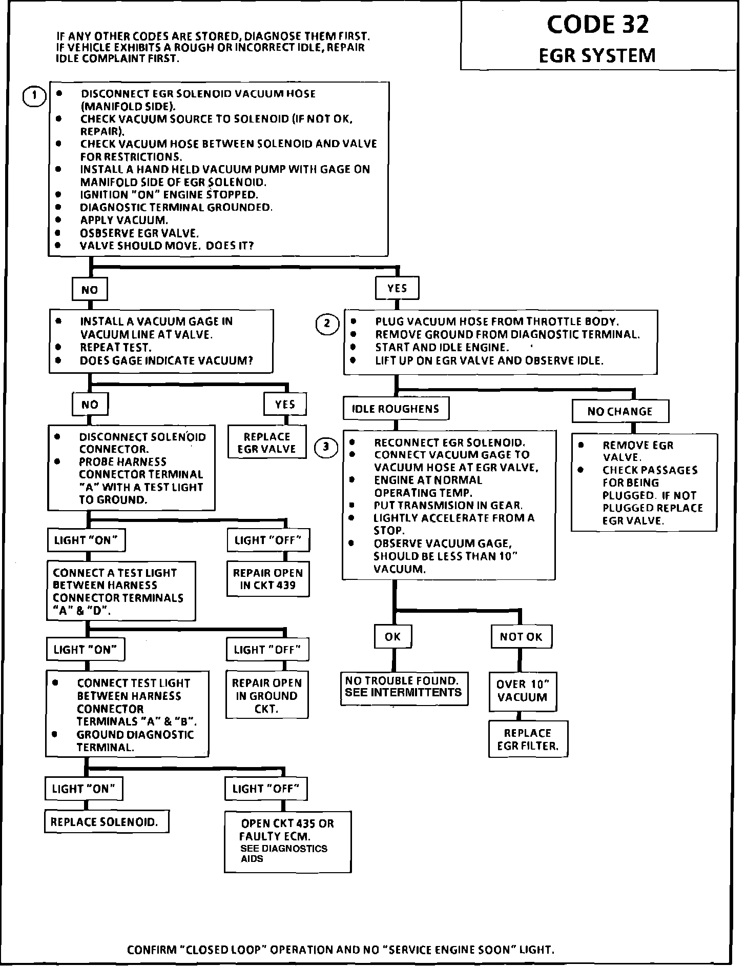 The ECM monitors EGR effectiveness by de-energizing the EGR control solenoid thereby shutting off vacuum to the EGR valve diaphragm. With the EGR valve closed, fuel integrator counts will be greater than they were during normal EGR operation. If the change is not within the calibrated window, a Code 32 will be set.
