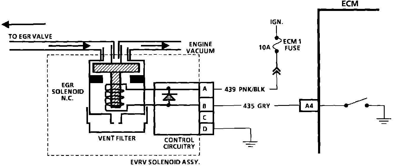 The ECM operates a solenoid to control the exhaust gas recirculation (EGR) valve. This solenoid is normally closed. By providing a ground path, the ECM energizes the solenoid which then allows vacuum to pass to the EGR valve.