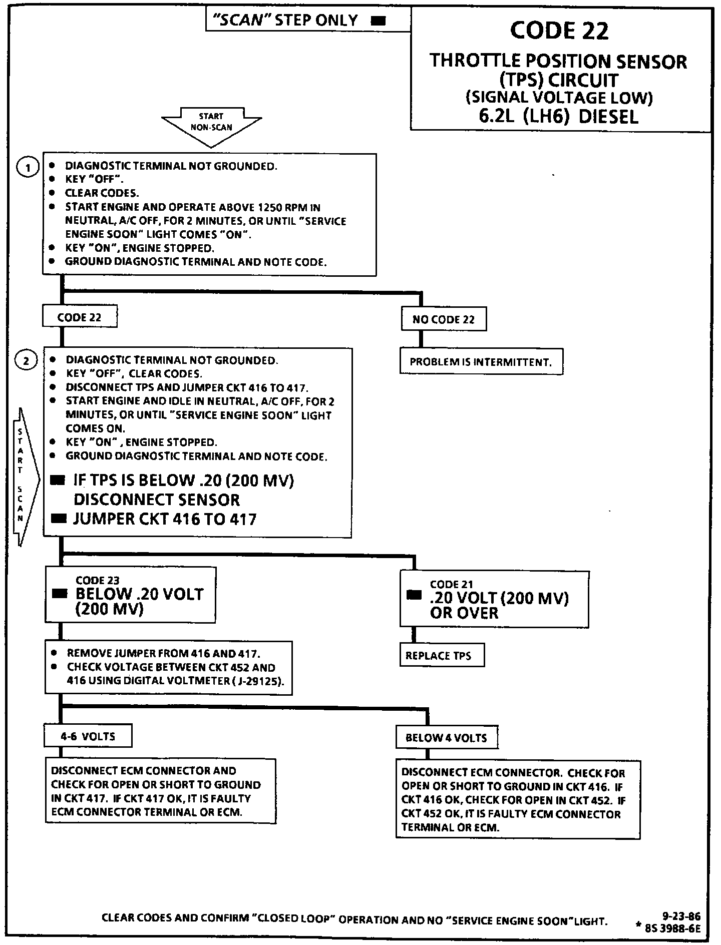 2. Simulates Code 21, (high voltage). If the ECM recognizes the high signal voltage, the ECM and wiring are OK. If signal voltage is still low, Code 23 will set, because the test was performed below 1250 rpm.
