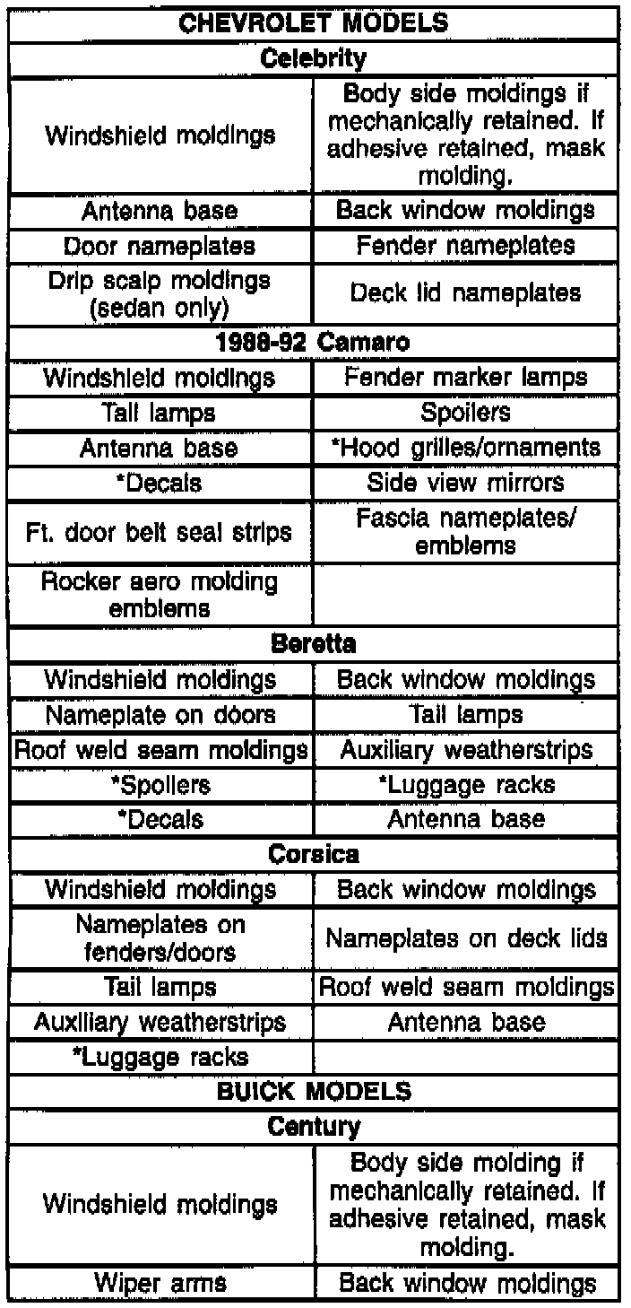Important:Some technicians may apply a small cord (wire, plastic tube, etc.) behind or underneath moldings that remain on the vehicle to improve sanding and painting. If the vehicle paint system is baked with cord in place, damage to some moldings may occur. If this technique is used, DO NOT BAKE PAINT, air dry only.