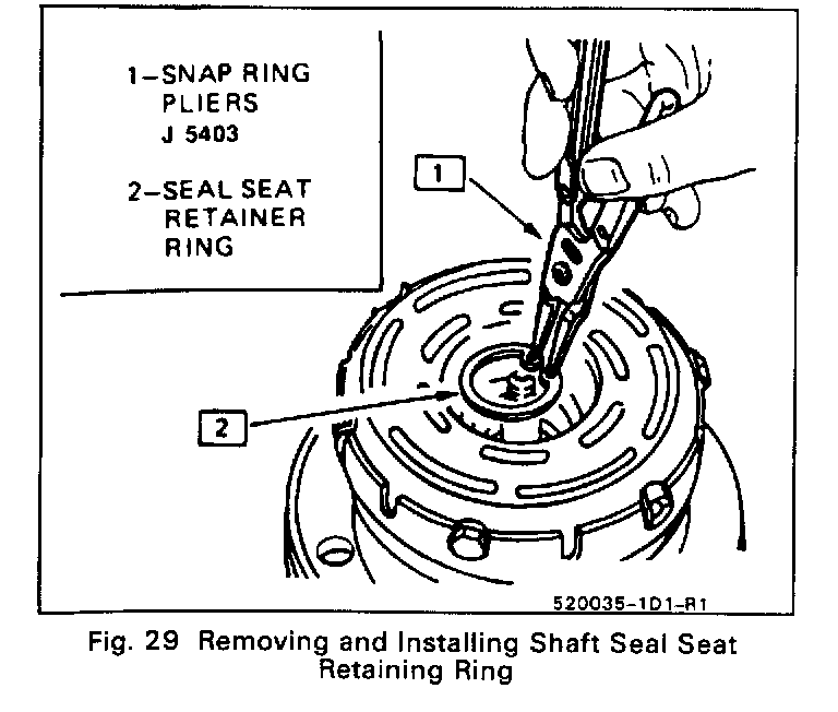 5. Install the new seal seat retainer ring with its flat side against the Seal Seat, using Snap-Ring Pliers J 5403 (Fig 29). Use the sleeve from O-ring Installer J 33011 to press in on the seal seat retainer ring so that it snaps into its groove.