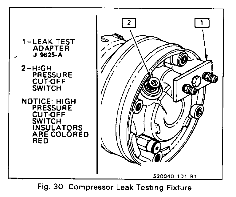 2. To Leak Test, install leak Test Fixture J 9625-A (Fig. 30) on rear head of compressor and connect gage charging lines and J 38100-C Refrigerant Recovery System. Pressurize suction and high-side of compressor with Refrigerant-12 vapor to drum pressure. Temporarily install the shaft nut and turn compressor shaft in normal direction of rotation several times by hand. Leak test the seal area and correct any leak found. Recover the refrigerant. Remove shaft nut.