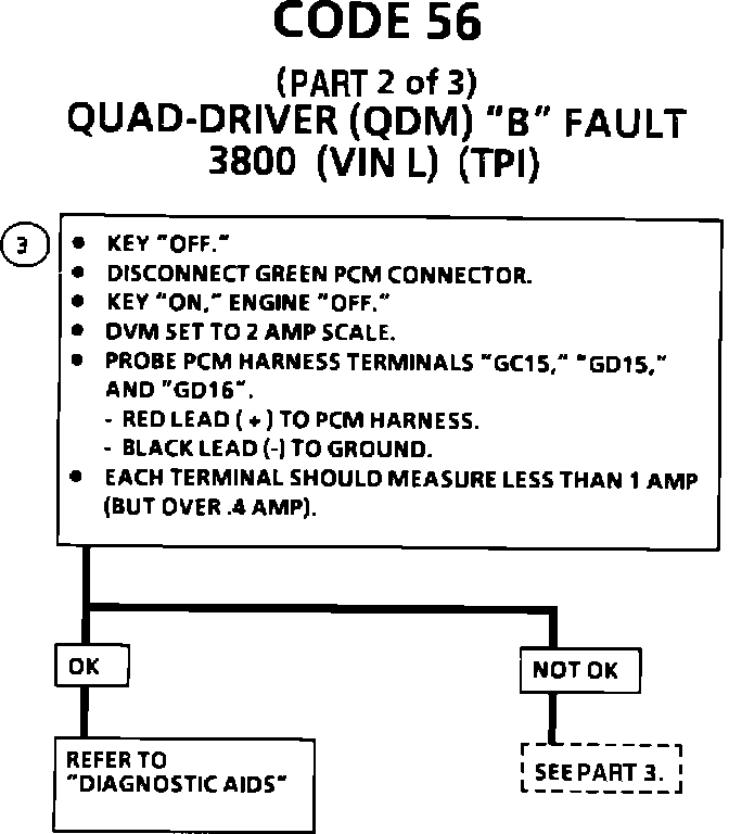 Each QDM has a fault line which is monitored by the PCM. The fault line signal is available on the data stream for "Scan" tool test equipment display on Tech 1. The PCM will compare the voltage at the QDM based on accepted values of the fault line. If the QDM "B" fault detection circuit senses a voltage other than the accepted value, the fault line will go from a "low" signal on the data stream to a "high" signal and Code 56 will set.