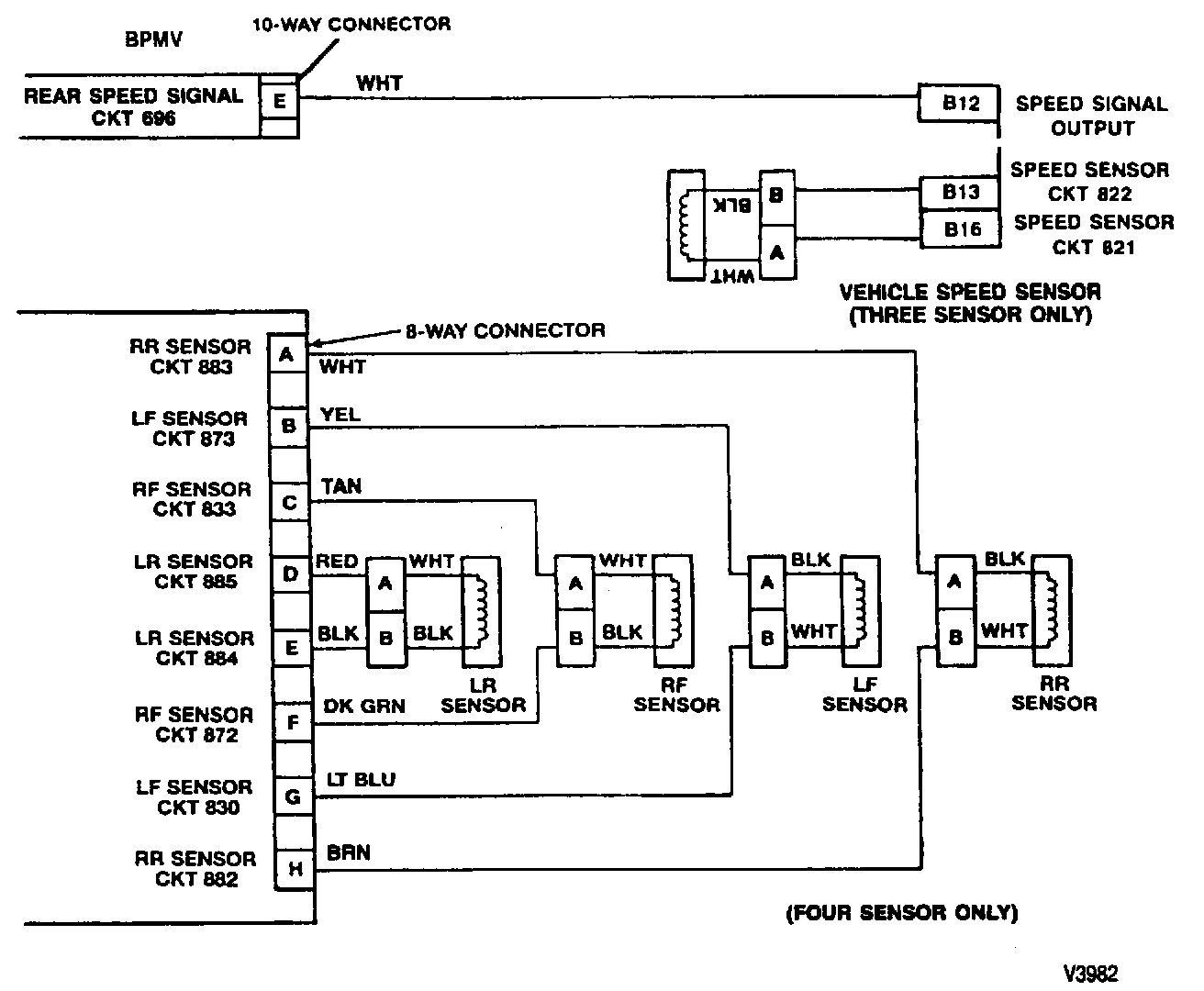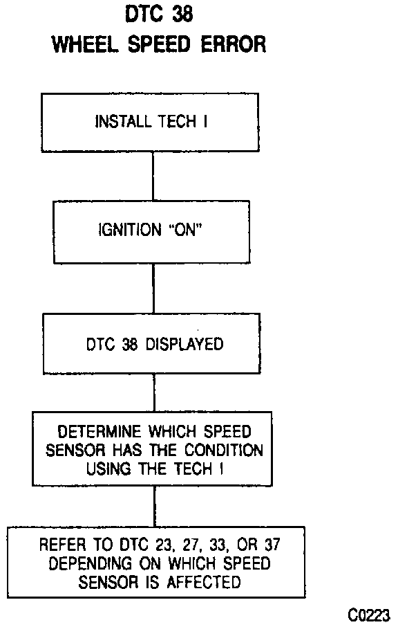 A DTC 38 relates to the BPMV seeing the signal from one sensor at more than double or less than half the frequency of the other sensors for a 12 second duration. This DTC also sets when all speed inputs differ more than eight percent. The vehicle speed must be over 12 mph for this DTC to set. Do not replace the BPMV for this DTC. A faulty BPMV will not cause this DTC to set.
