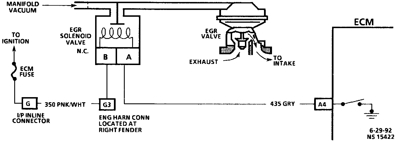 The Exhaust Gas Recirculation (EGR) valve is controlled by a normally closed solenoid valve. The ECM turns the solenoid "ON" to allow vacuum to pass to the EGR, and turns the solenoid "OFF" to prevent EGR operation.