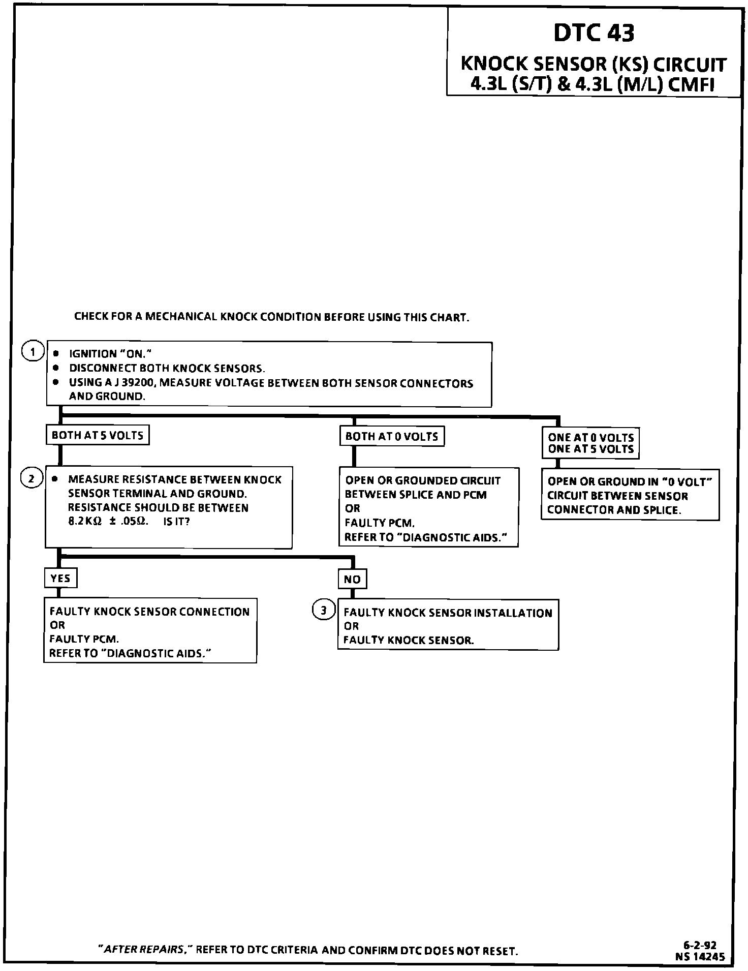 The DTC 43 circuit consists of two knock sensors with one wire that is spliced together and goes directly to the PCM. There are two DTC 43 cheeks performed by the PCM. One check consists on monitoring CKT 496 for a voltage that is above 0.63 volts and below 3.0 volts.