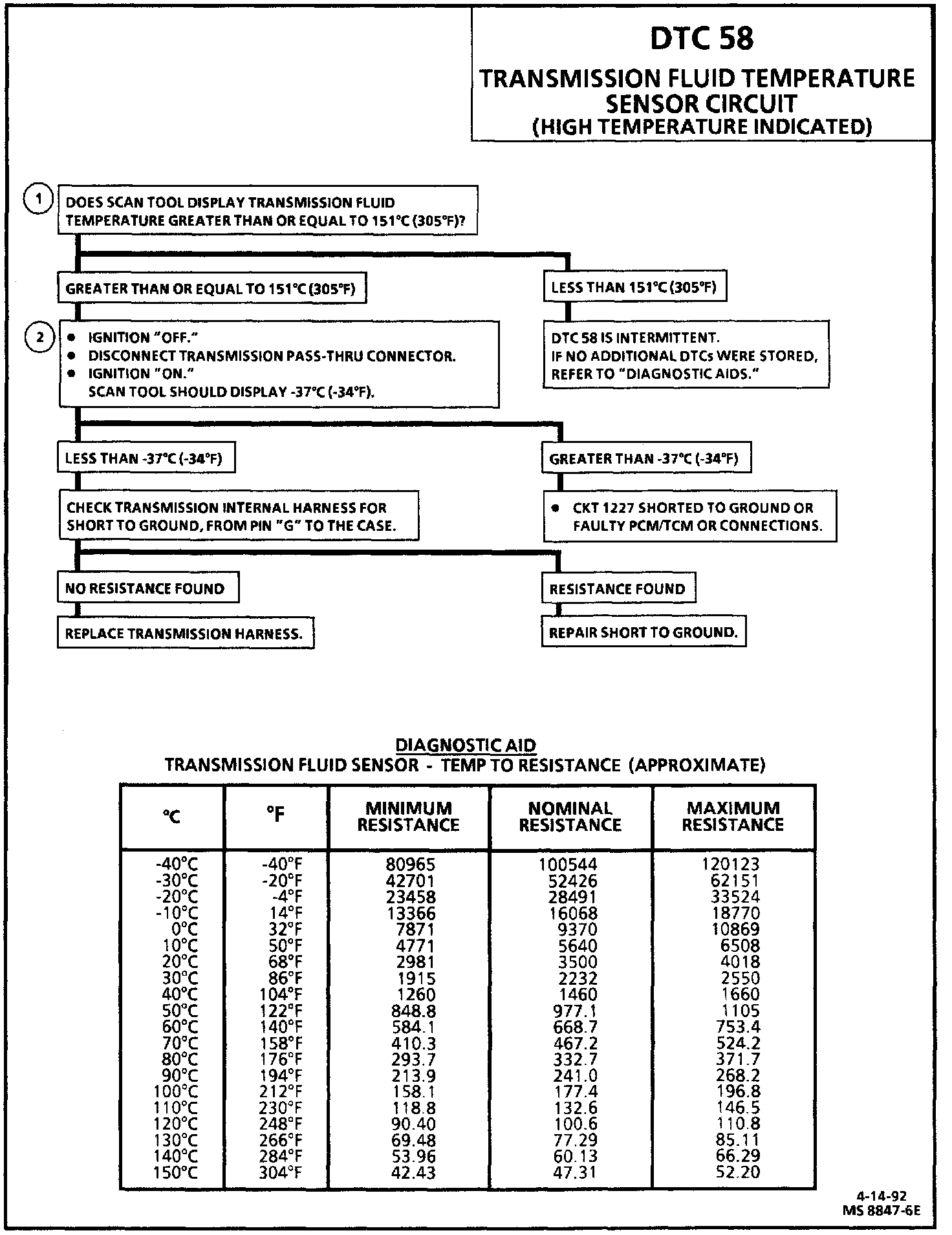 The temperature to resistance value scale, in figure, may be used to test the transmission sensor at the various temperature levels to evaluate the possibility of a "skewed" sensor. A "skewed" sensor could result in delayed garage shifts or TCC enabled complaints.