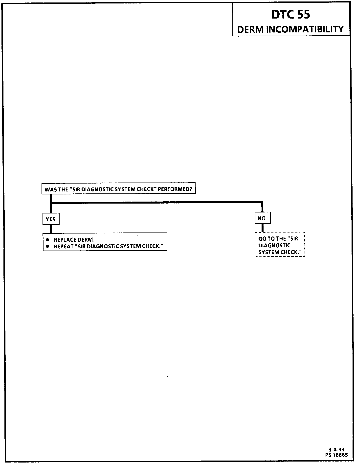 When "Ignition 1" voltage is first applied to the DERM it will perform "Turn-ON" tests followed by "Continuous Monitoring" for one second. The DERM also monitors "Driver Side Low" terminal "B8" to ensure that voltage is being applied to the inflator module and monitors "Driver Source Sense" terminal "A5" to ensure that "Driver 36 VLR" is supplying voltage to the deployment loop. Ground is applied at terminal "B7" (passenger side low for a Driver/Passenger DERM) and the voltage is measured at "Driver Side Low" and at terminal "A6" (passenger source sense for a Driver/Passenger DERM). When grounding terminal "B7" grounds "Driver Side Low" or voltage is measured at terminal "A6", DTC 55 is set.
